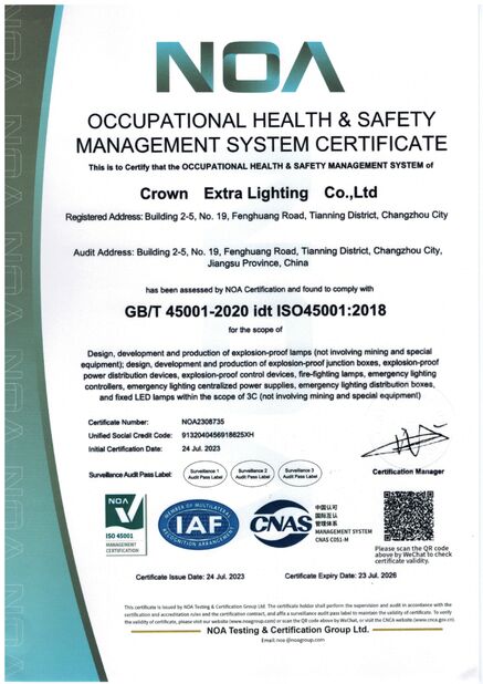 গণপ্রজাতন্ত্রী চীনের GB3836.1/ GB3836.2-2010 জাতীয় বিস্ফোরণ প্রমাণ মান অনুযায়ী, কোম্পানিটি জাতীয় আলোর গুণমান তত্ত্বাবধান ও পরিদর্শন কেন্দ্রের কর্মক্ষমতা পরীক্ষায় উত্তীর্ণ হয়েছে এবং বিস্ফোরণ-প্রমাণ শংসাপত্র এবং পরীক্ষার রিপোর্ট পেয়েছে; পরবর্তীকালে, এটি EU ATEX সার্টিফিকেশন, ISO9001:2008, RoHS সার্টিফিকেশন এবং উৎপাদন লাইসেন্সের মতো ম্যানেজমেন্ট সিস্টেম সার্টিফিকেশন পেয়েছে। কোম্পানিটি উন্নত উত্পাদন সরঞ্জাম এবং পরীক্ষার সরঞ্জাম দিয়ে সজ্জিত, একটি উচ্চ যোগ্যতাসম্পন্ন এবং অভিজ্ঞ R & D প্রযুক্তিগত দল এবং ব্যবস্থাপনা দল রয়েছে, এন্টারপ্রাইজ ম্যানেজমেন্ট, পণ্যের নকশা, প্রক্রিয়ার মান নিয়ন্ত্রণ এবং প্রতিক্রিয়ার জন্য ম্যানেজমেন্ট সিস্টেমের সাথে কঠোরভাবে, কার্যকরভাবে নিশ্চিত করে বিস্ফোরণ প্রমাণ LED আলো এবং পরিষেবার গুণমান.